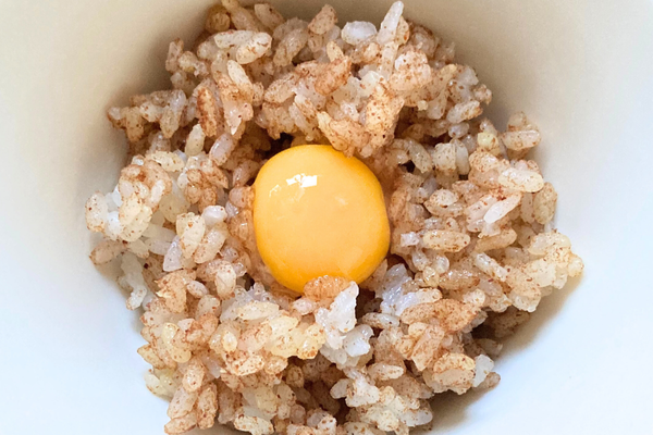ごはんに生卵をのせて、おさかなパウダーをひとふり。醤油で味を整えたら完成。