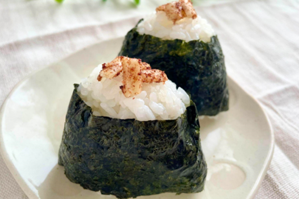 ご飯の中心に具材を乗せ、包み込むように握り海苔を巻いて完成。