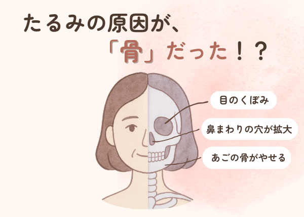 たとえば、頬骨やあごの骨が内側に下がると、皮膚を支える“土台”が減り、結果としてたるみやくぼみ、ほうれい線が目立ちやすくなります。