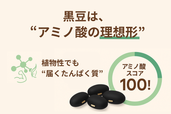 黒豆(大豆)のアミノ酸スコアは100で、牛肉・豚肉・鶏肉・魚類と同水準。