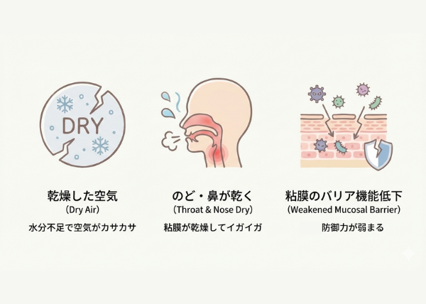 乾燥すると、ウイルスに対する防御力が下がりやすくなります。