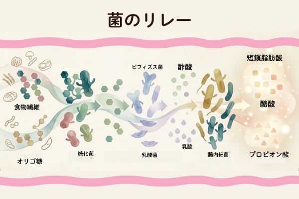 食物繊維をきっかけに、菌たちがバトンをつなぐように働き、